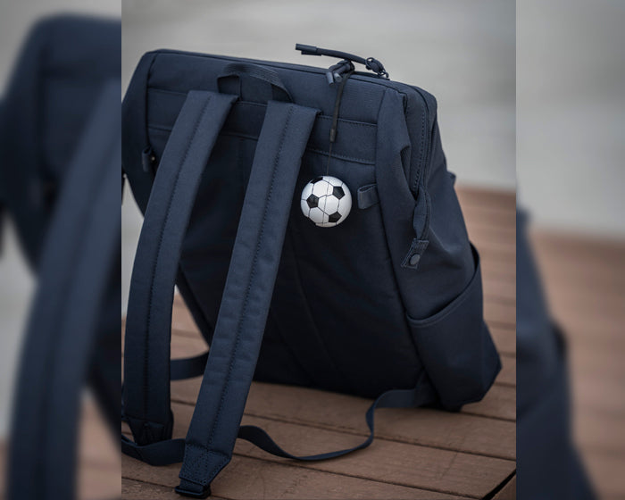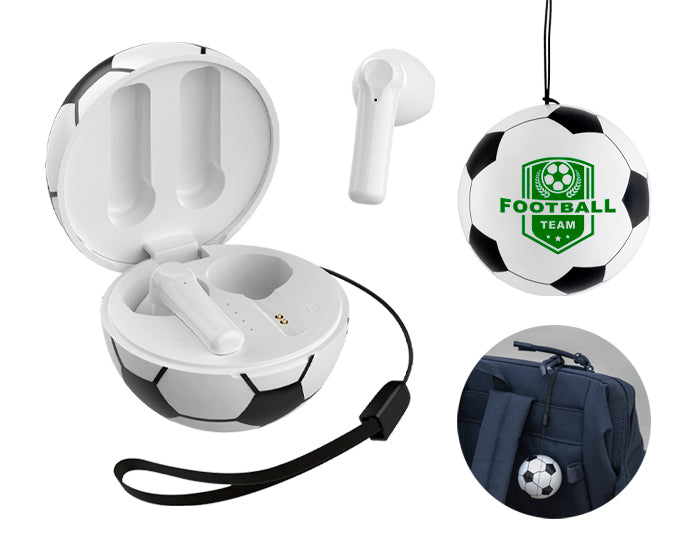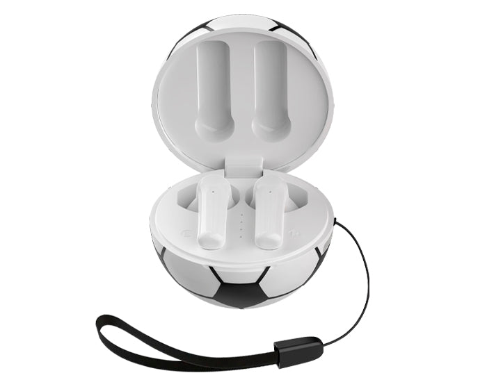 Audífonos inalámbricos Bluetooth con estuche de carga de 220 mAh en forma de balón de fútbol soccer.