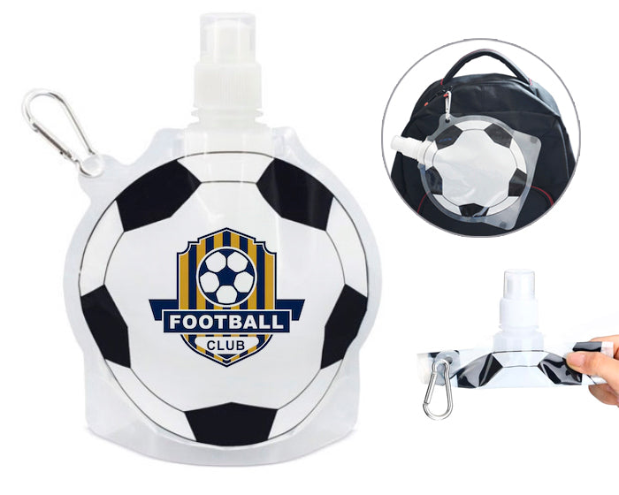 olsa para bebidas con diseño de balón de fútbol, con tapa de rosca y válvula con tapón, incluye arnés metálico para colgar.