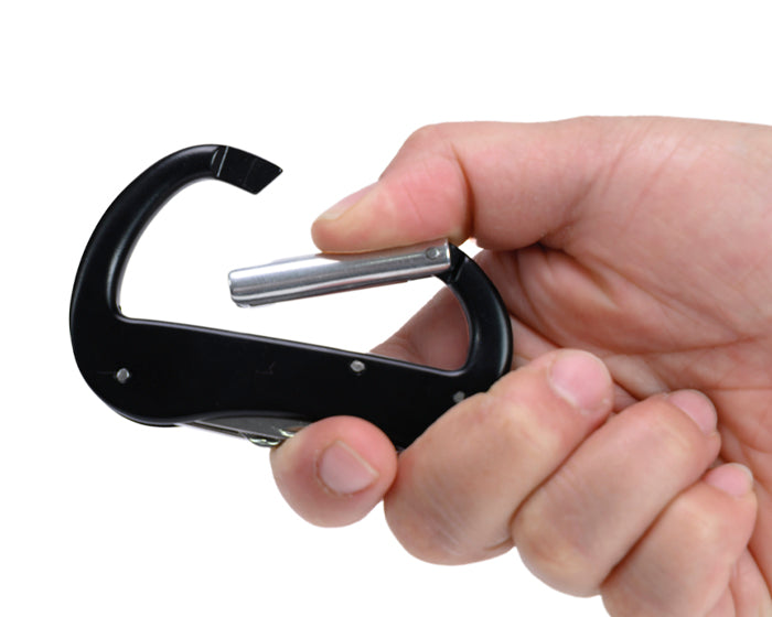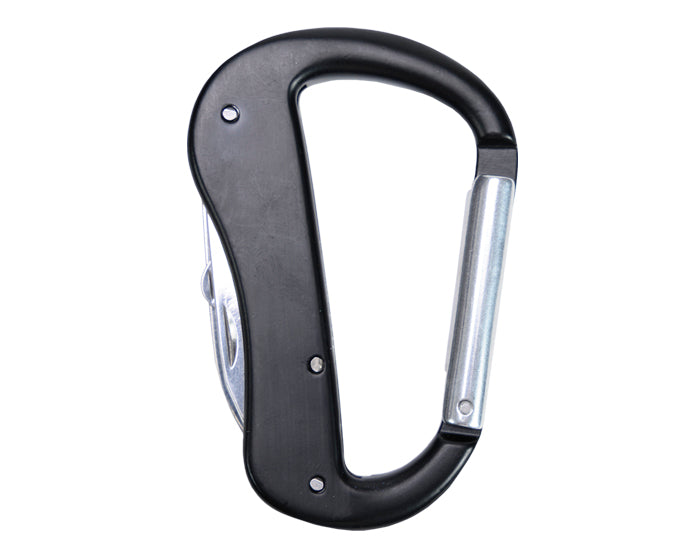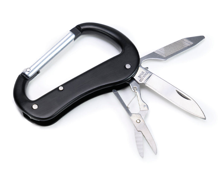 Gancho con clip multifunción que incluye: tijeras, navaja y destapador con lima.