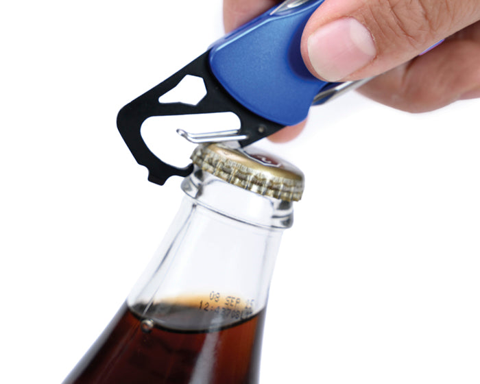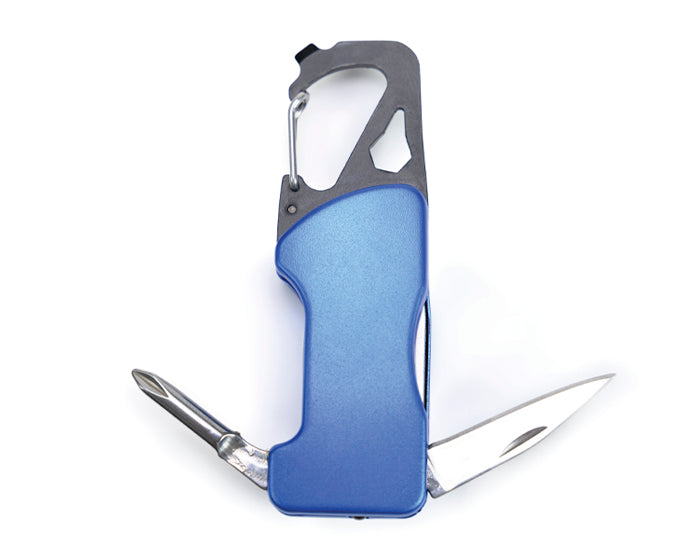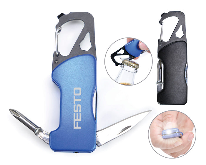 ancho con clip multifunción que incluye: Luz LED con botón de encendido/apagado, navaja, destapador, llave allen, mini desarmador plano y desarmador de cruz.