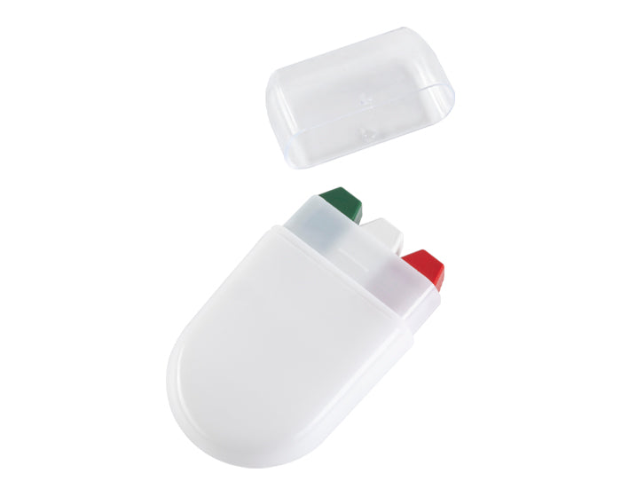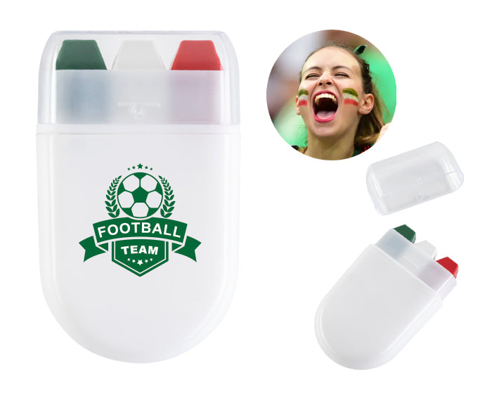 Barra de pintura facial tricolor en verde, blanco y rójo; cuenta con estuche de plástico con tapa para su fácil aplicación y manejo.