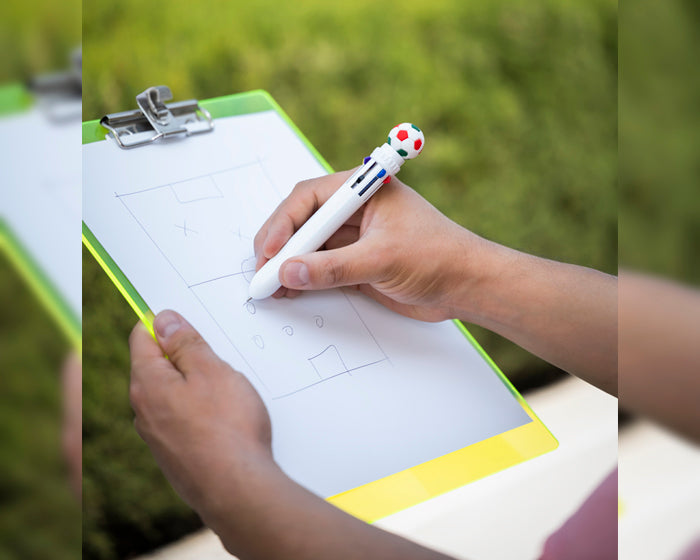 Bolígrafo de plástico multitintas con figura de balón tricolor de soccer en la parte superior, incluye 8 colores de tinta diferentes.