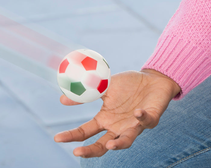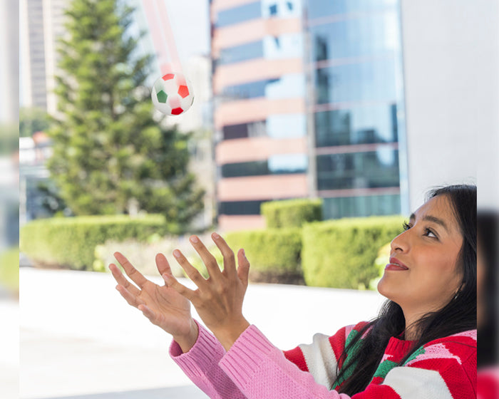 elota tricolor de alto rebote, en forma de balón de fútbol soccer.
