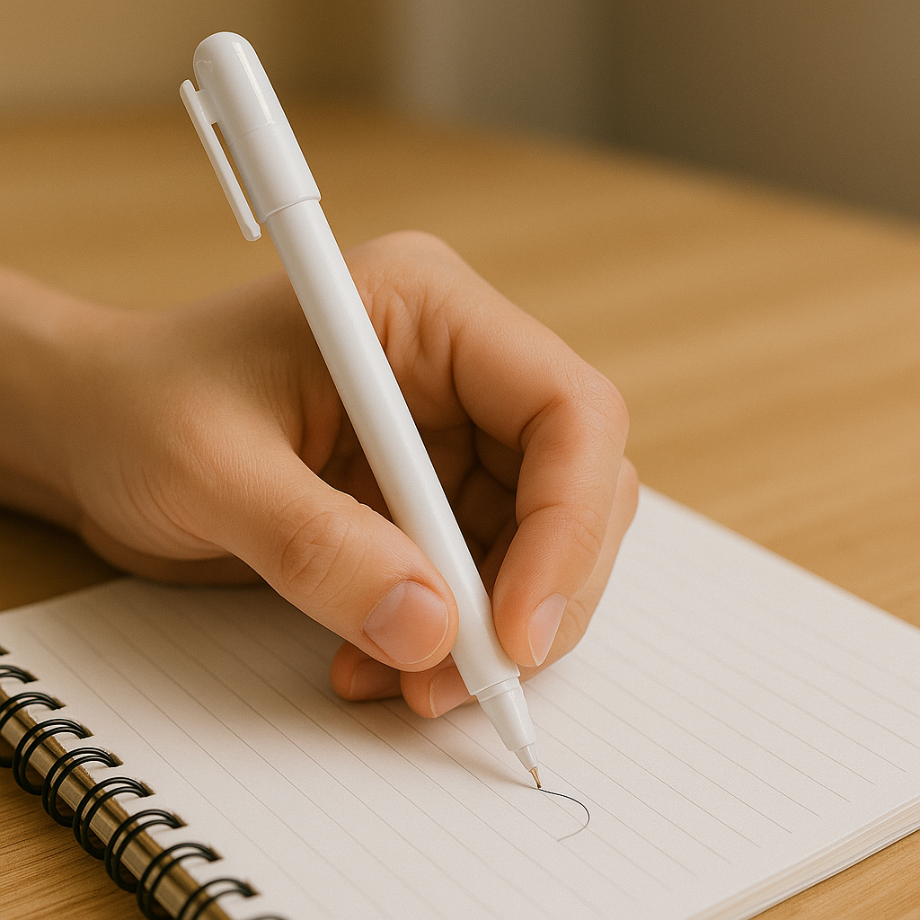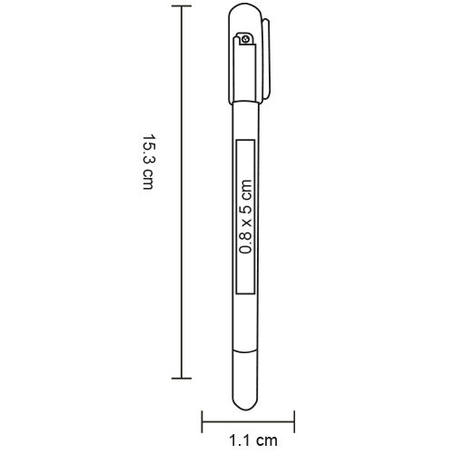 olígrafo de plástico con punta fina en el extremo inferior y sello de línea con figura de balón en el extremo superior.