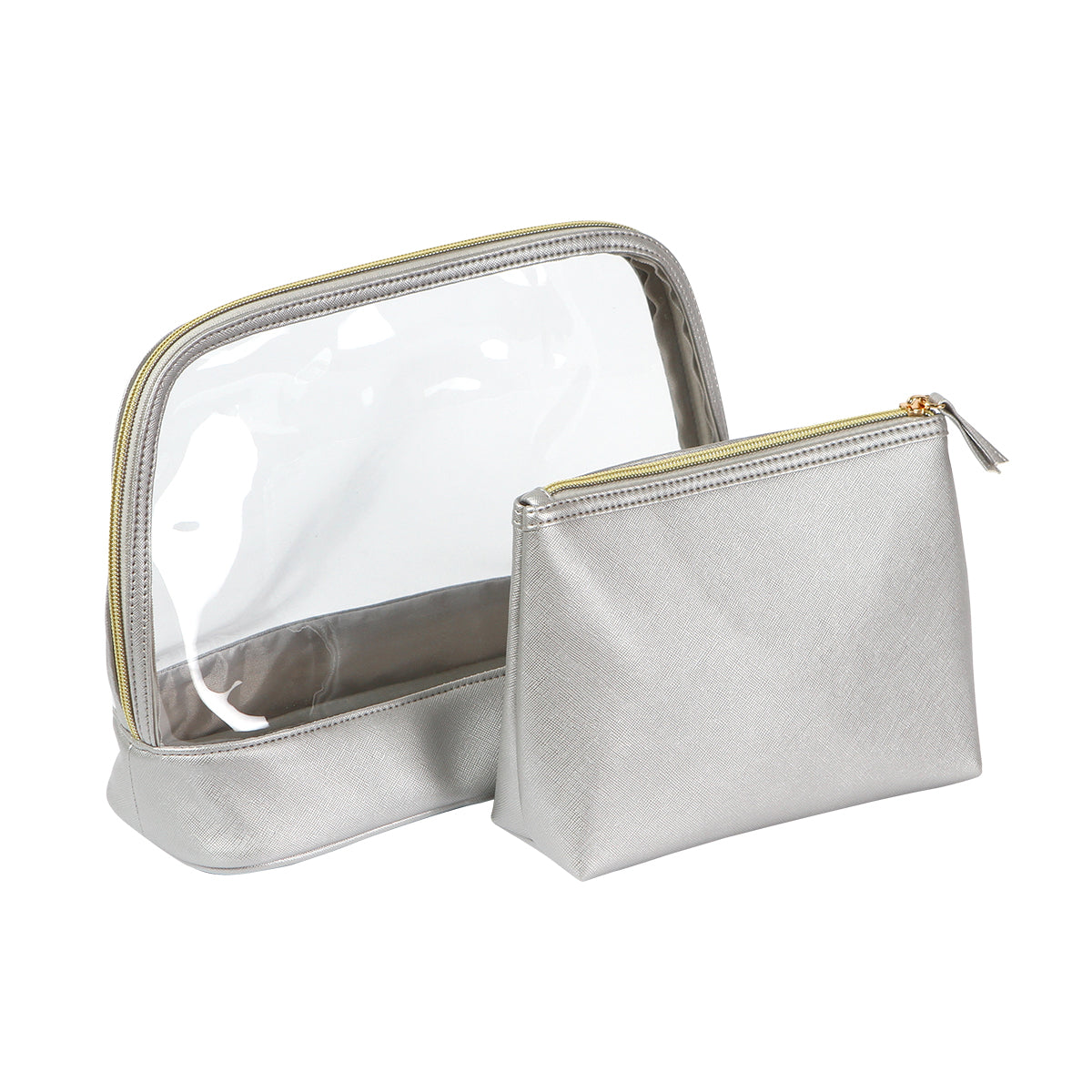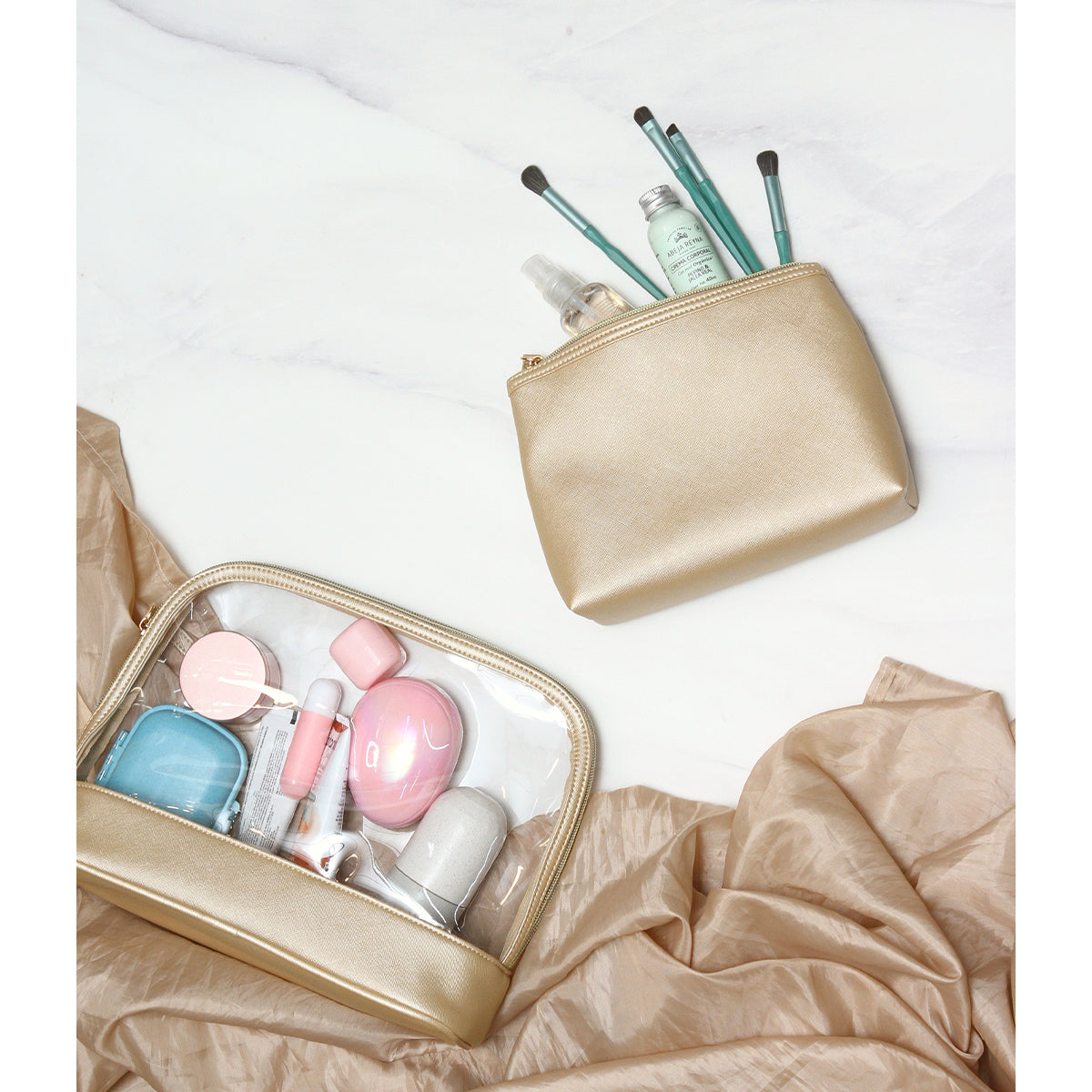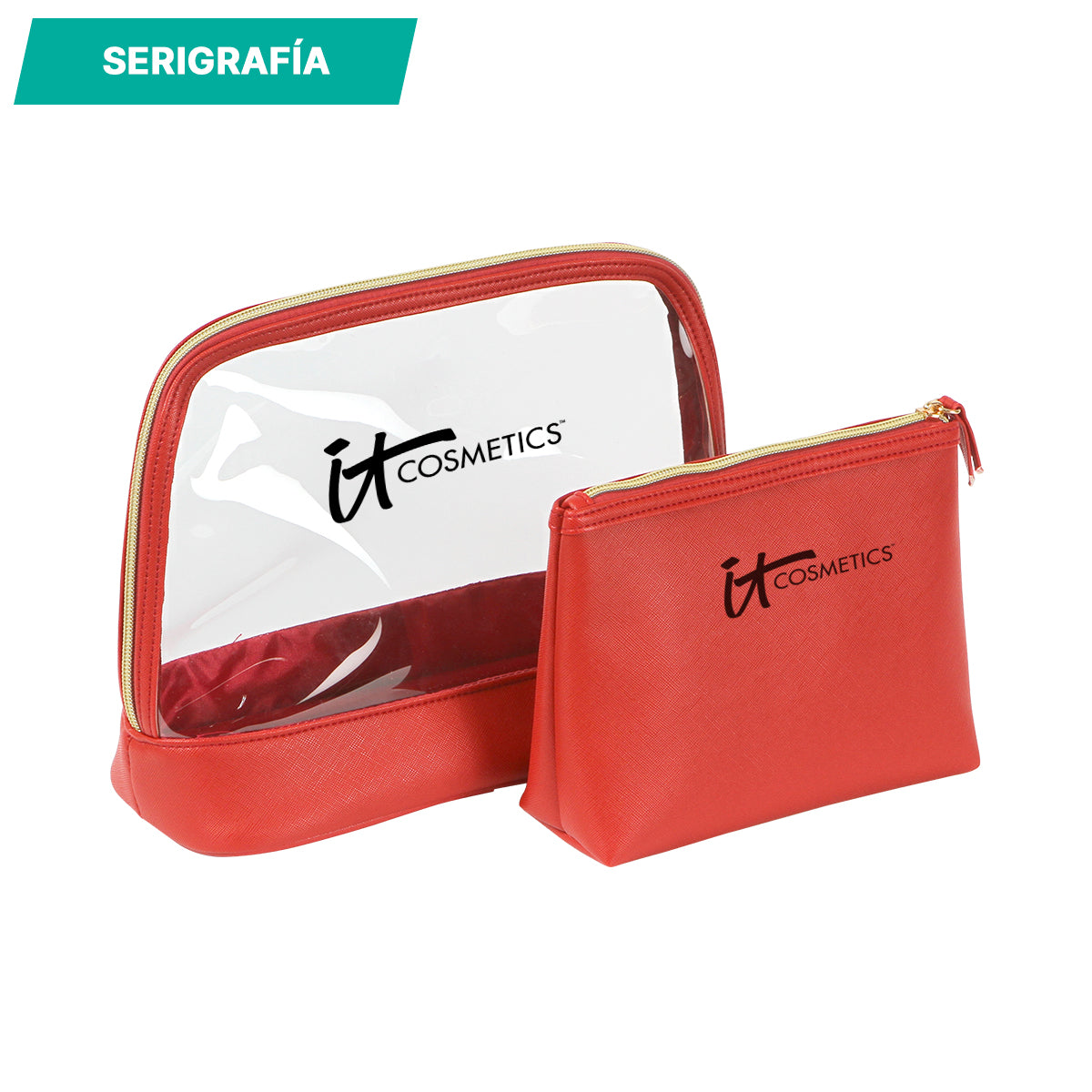 Incluye una cosmetiquera grande fabricada en plástico PVC transparente, perfecta para visualizar y acceder rápidamente a su contenido, con cierre seguro y diseño resistente.