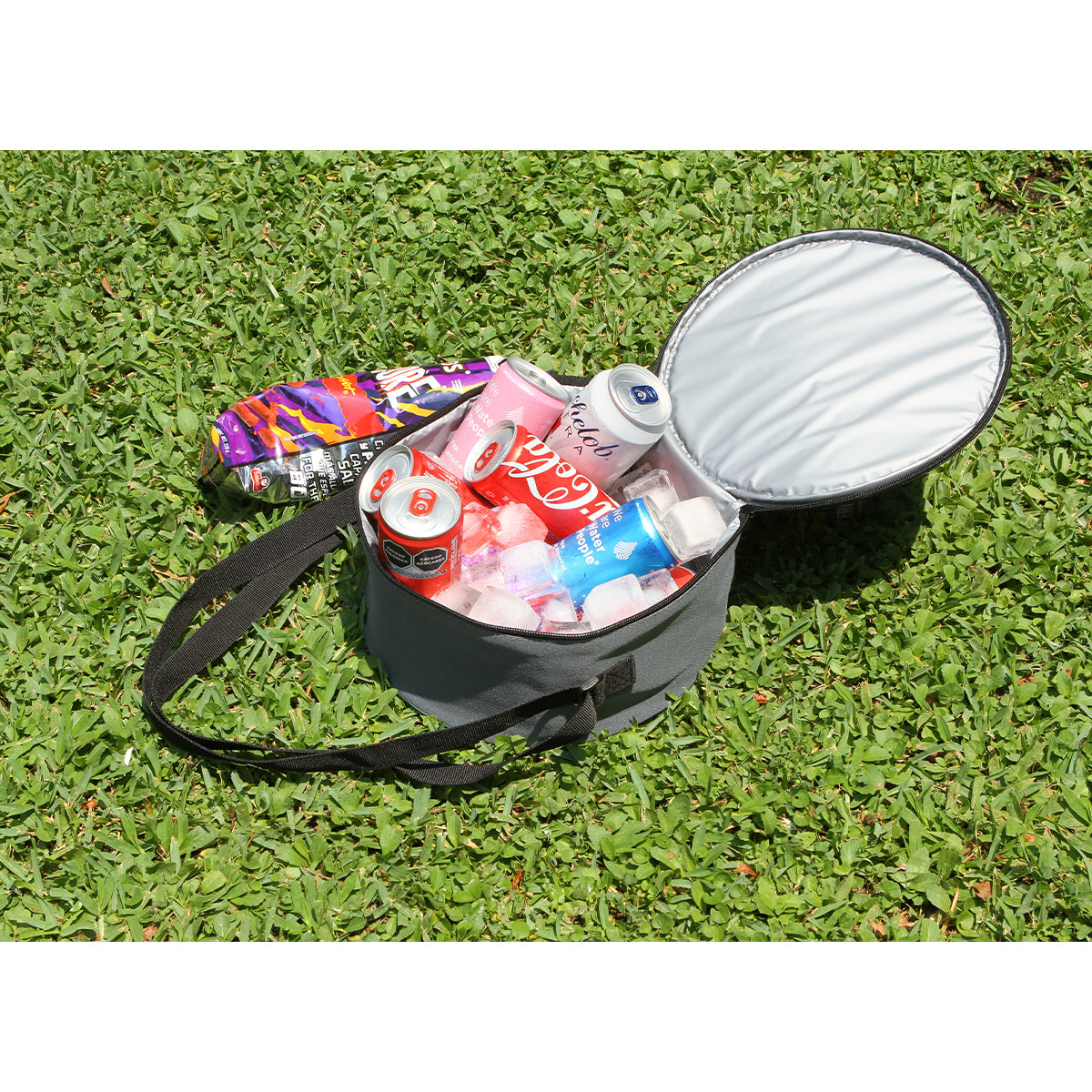 Hielera fabricada en poliéster y forro interno de PEVA, cuenta con un compartimento principal con cierre.