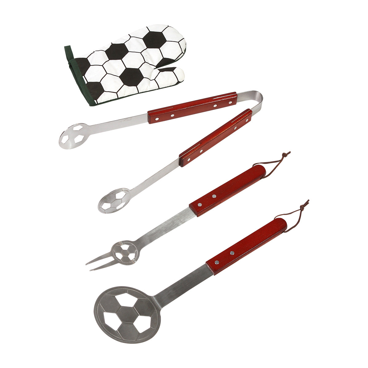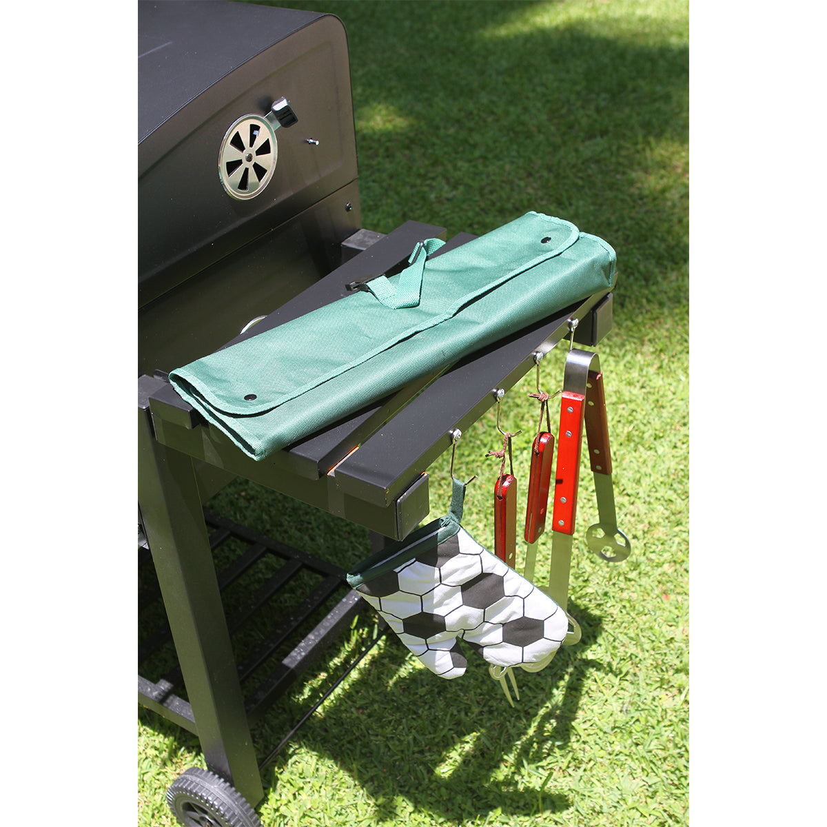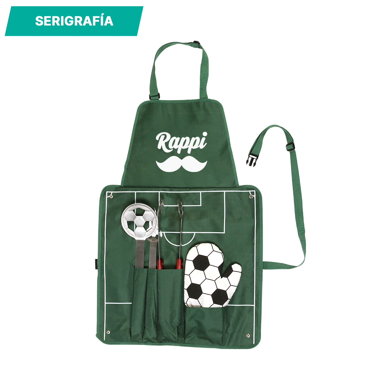 Fabricado con herramientas de acero inoxidable de alta calidad, que garantizan resistencia, durabilidad y fácil limpieza, y un mandil de poliéster con un diseño de cancha de fútbol que no pasará desape.