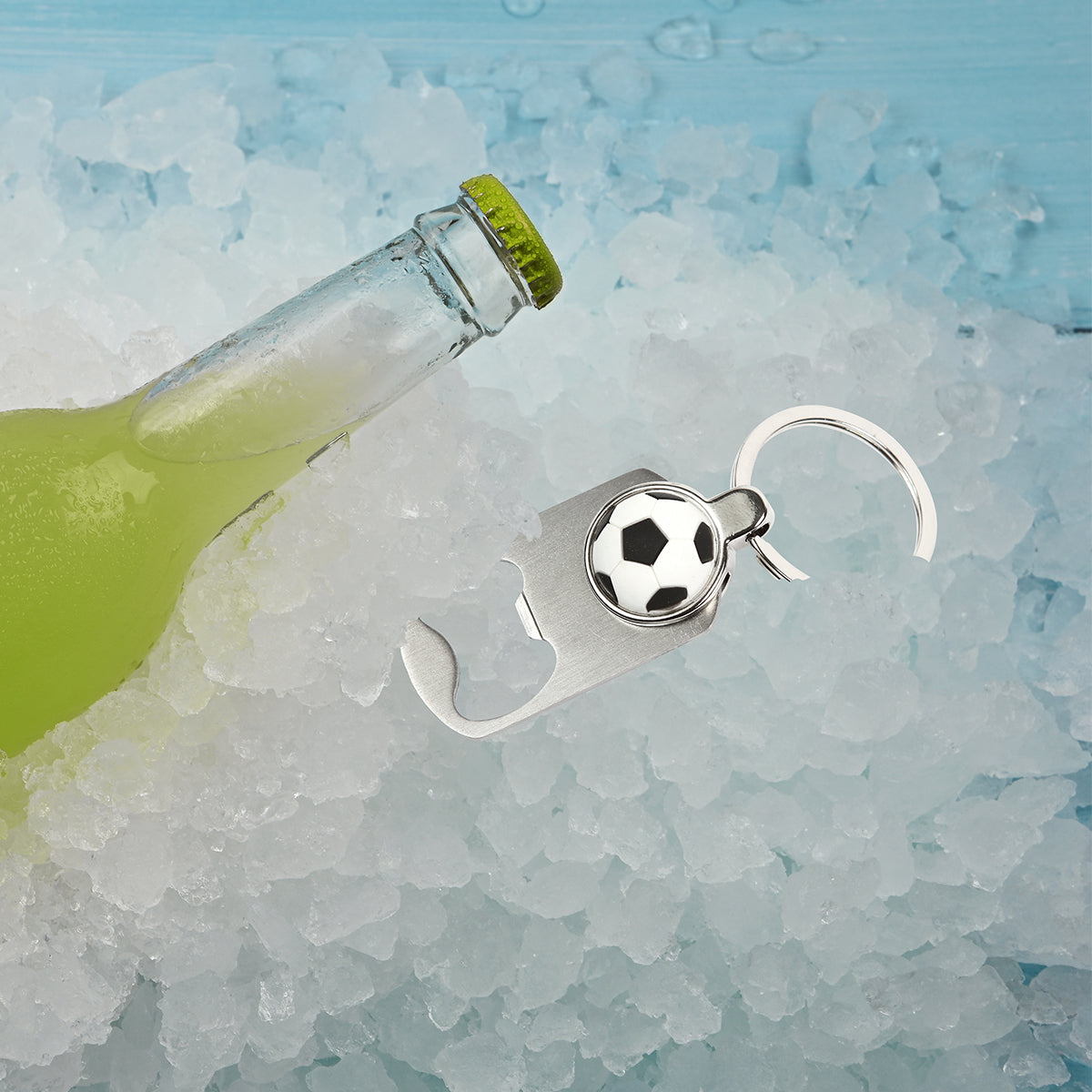 Llavero fabricado en acero inoxidable con destapador integrado y detalle decorativo de balón de fútbol.