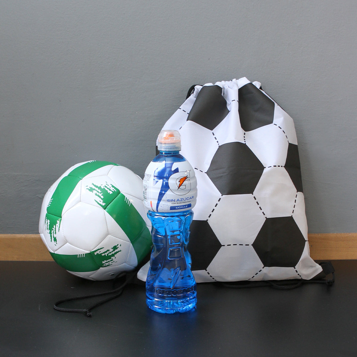 Es una bolsa ligera y práctica con un llamativo print de balón de fútbol, perfecta para uso diario o llevar tus esenciales con estilo deportivo.
