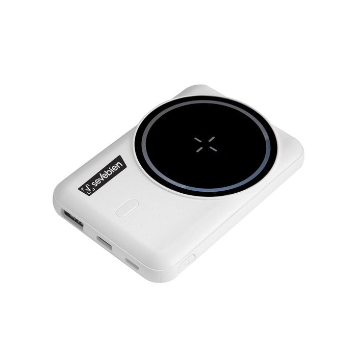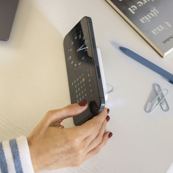 Power bank inalámbrico con aro magnético y soporte de anillo.