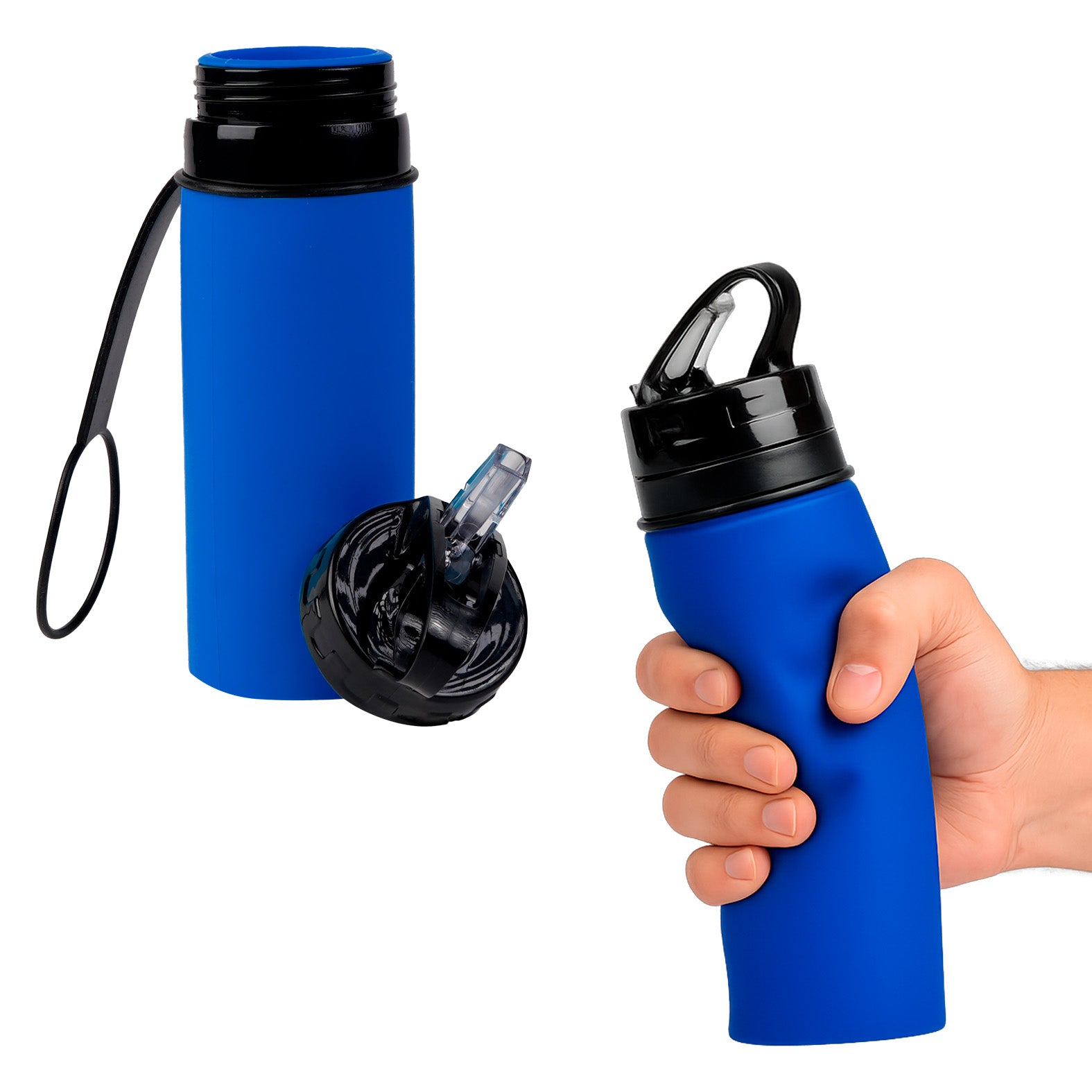 Cilindro de silicón, con tapa enroscable, boquilla abatible, agarradera en la parte superior y asa de silicón removible.