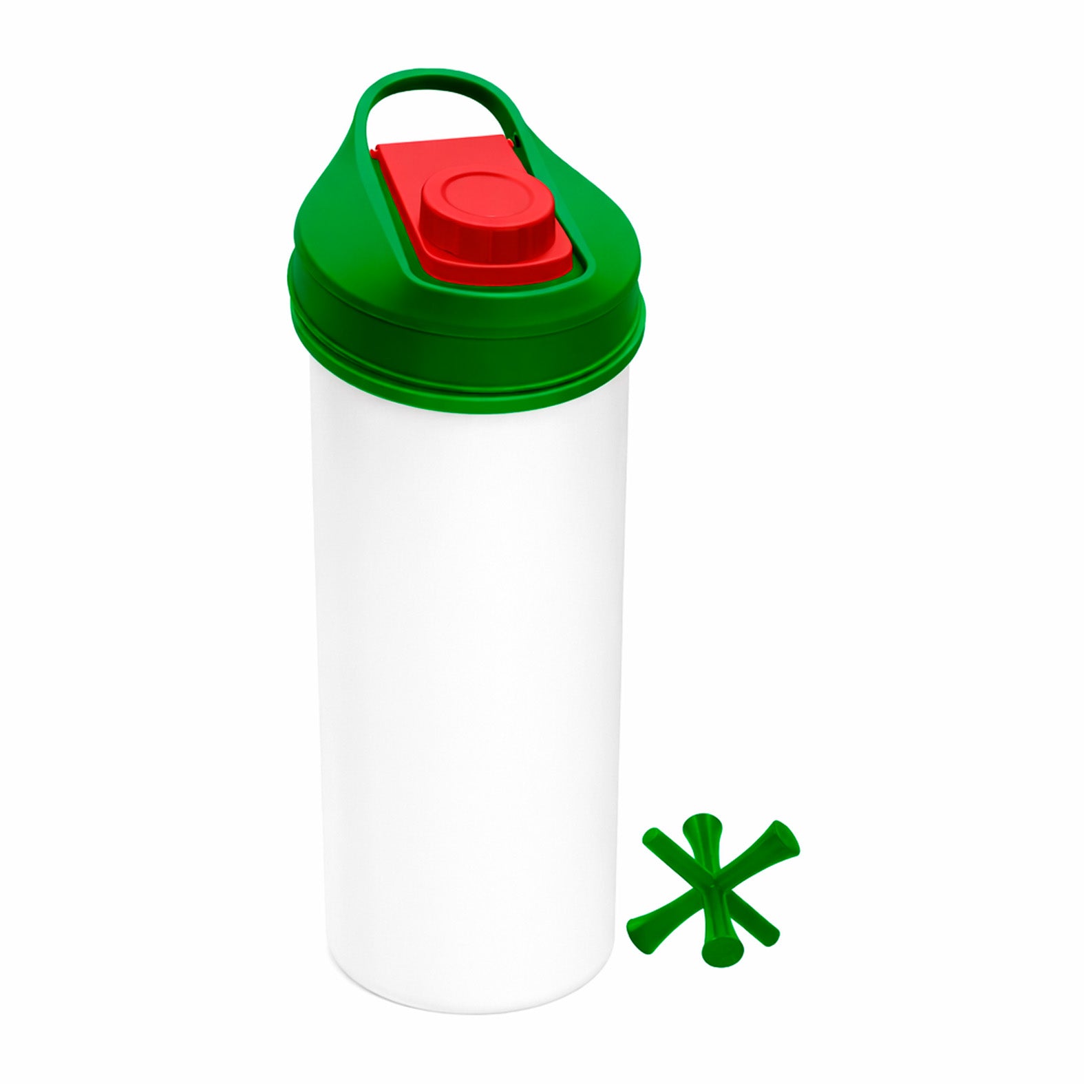 ilindro de plástico sólido tricolor con pieza plástica para batir, tapa enroscable y asa.