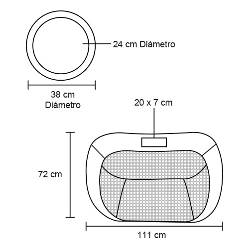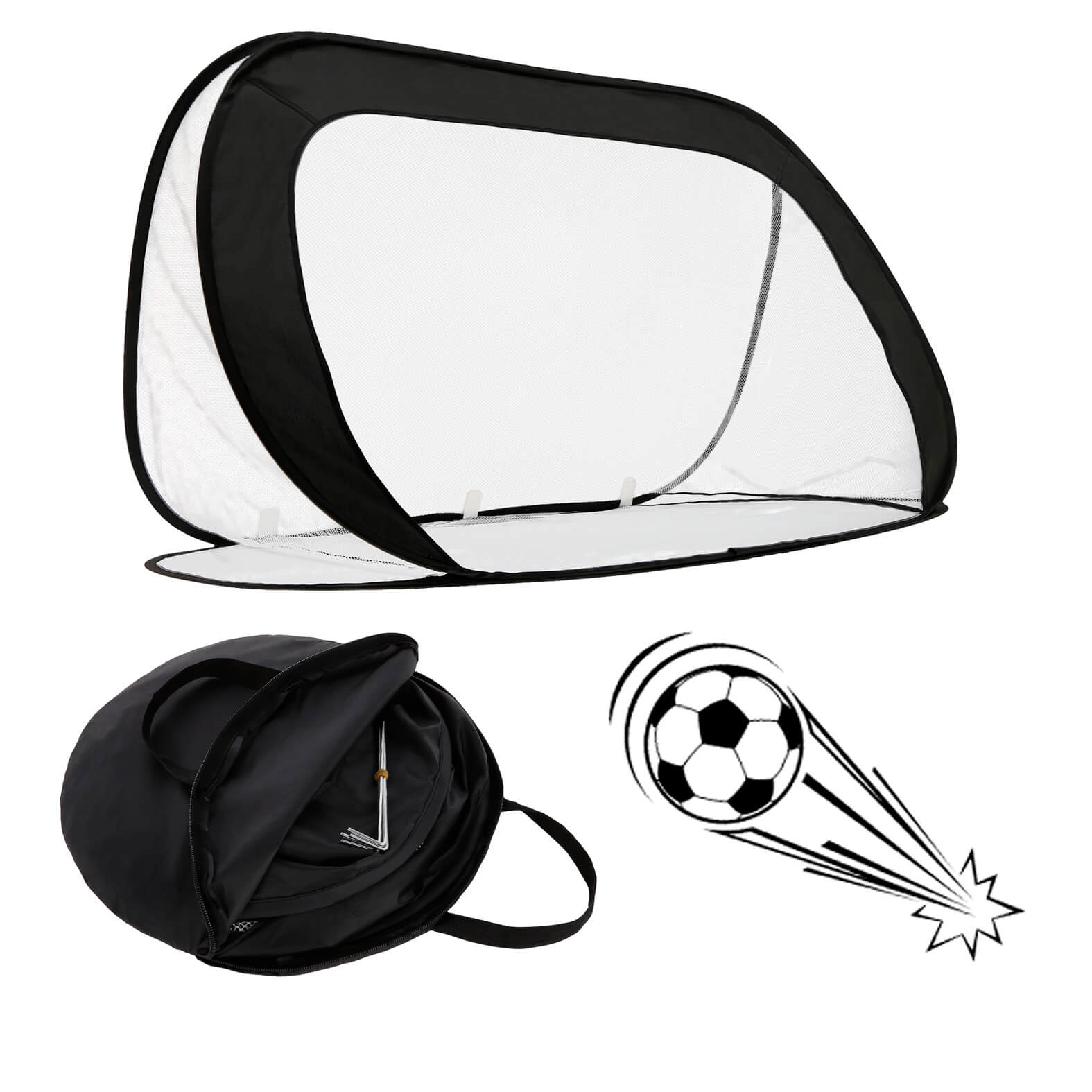 ortería plegable de poliéster con broches de velcro, 4 asas y 4 estacas de metal para fijarla al suelo.